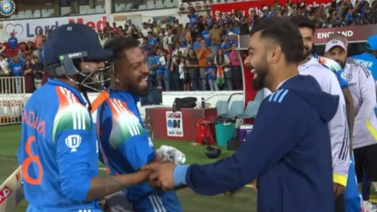 कोहली का जो वीडियो वायरल हो रहा, उसमें वो मैच खत्म होने के बाद हार्दिक पंड्या और रवींद्र जडेजा के साथ चुहलबाजी करते नजर आ रहे। वीडियो में देखा जा सकता है कि कोहली पहले हार्दिक से कुछ कहते हैं और इसके बाद तीनों जोर-जोर से हंसने लगते हैं।