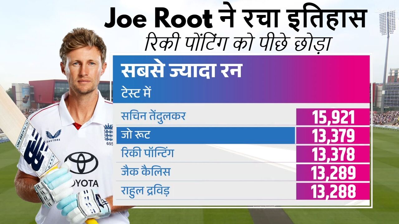 मैनचेस्टर Test: इंग्लैंड के अनुभवी बल्लेबाज जो रूट ने टेस्ट क्रिकेट में एक और बड़ी उपलब्धि अपने नाम की है। उन्होंने ऑस्ट्रेलिया के दिग्गज रिकी पोंटिंग के 13,378 रन के रिकॉर्ड को पीछे छोड़ दिया है। अब रूट टेस्ट इतिहास में सबसे ज्यादा रन बनाने वाले दूसरे खिलाड़ी बन गए हैं। यह ऐतिहासिक पल भारत और इंग्लैंड के बीच मैनचेस्टर के ओल्ड ट्रैफर्ड स्टेडियम में खेले जा रहे चौथे टेस्ट के तीसरे दिन देखने को मिला।