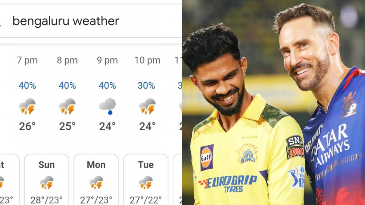 डिफेंडिंग चैंपियन चेन्नई सुपर किंग्स और रॉयल चैलेंजर्स बेंगलुरु के बीच रोमांचक मैच होने की उम्मीद है। गूगल पर 'RCB vs CSK Match' ट्रेंड कर रहा है। वहीं, गूगल इंडिया ने एक्स पर पोस्ट में बताया कि इस समय क्रिकेट फैंस बेंगलुरु का वेदर चेक कर रहे हैं। दरअसल, बेंगलुरु में इन दिनों बारिश के आसार हैं और इस मैच में भी बारिश की संभावना जताई गई है। ऐसे में अगर बारिश हुई तो इसका सीधा फायदा चेन्नई को होगा।
