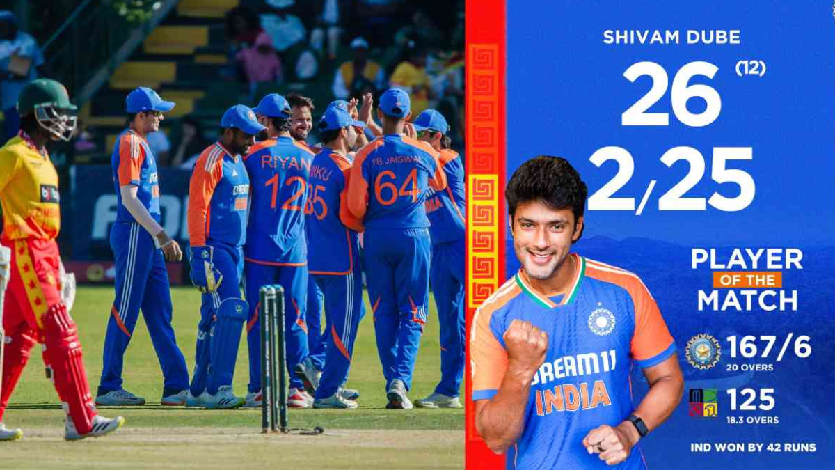 इससे पहले जिम्बाब्वे ने टॉस जीतकर गेंदबाजी करने का फैसला किया। टीम इंडिया ने 20 ओवर में 6 विकेट पर 167 रन बनाए। संजु सैमसन ने सबसे ज्यादा 58 रन बनाए। शिवम दुबे ने 26 रन और रियान पराग ने 22 रन बनाए। वहीं, जिम्बाब्वे की तरफ से कोई बल्लेबाज टिककर नहीं खेल पाया। डायन मायर्स ने सबसे ज्यादा 34 रन बनाए। भारत की तरफ से मुकेश कुमार को 4 विकेट, शिवम दुबे को 2 विकेट मिले। अभिषेक शर्मा, तुषार देशपांडे और वॉशिंगटन सुंदर को एक-एक विकेट मिला। भारत ने मैच में दो बदलाव किए। खलील अहमद की जगह मुकेश कुमार को खिलाया गया है। वहीं, ऋतुराज गायकवाड़ की जगह रियान पराग को मौका दिया गया था।