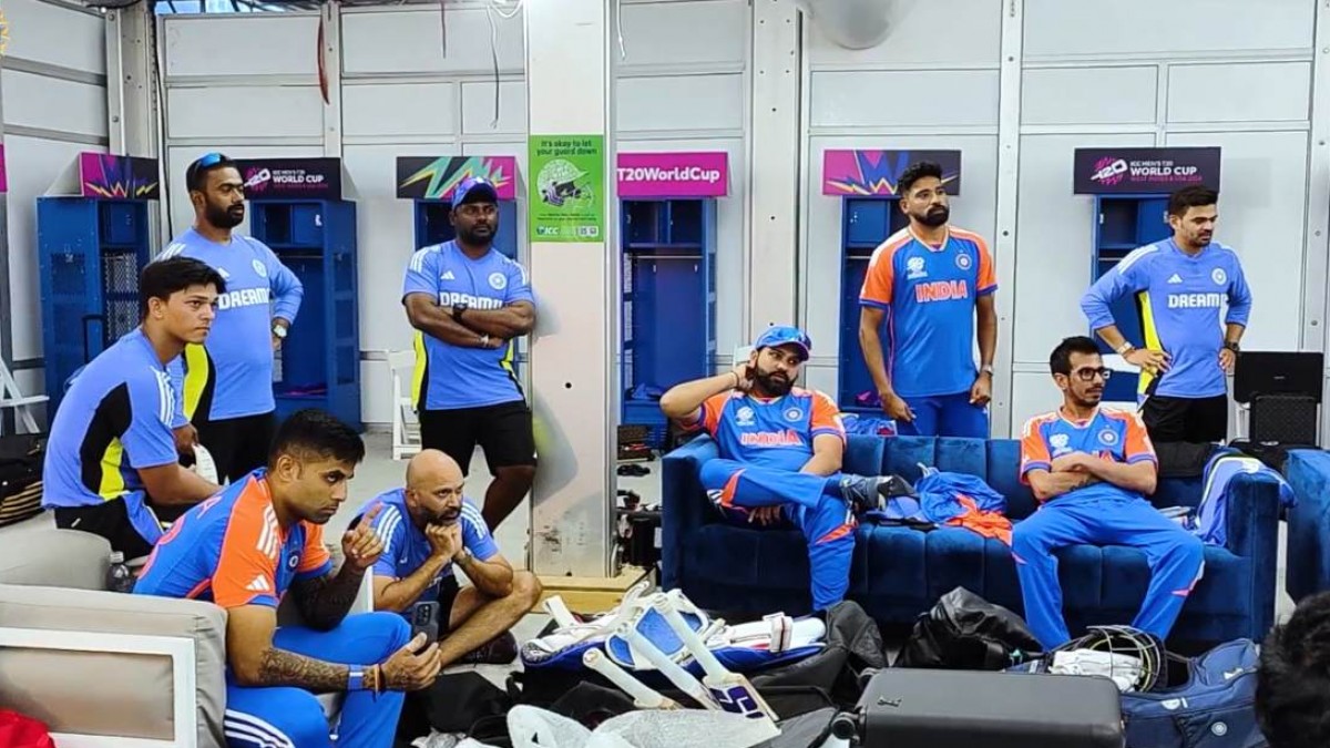 Team India Dressing Room: टी20 विश्वकप 2024 में भारतीय क्रिकेट टीम मैच जीतने के बाद खिलाड़ियों का सम्मान करती है। यह परंपरा 2023 वनडे विश्वकप से शुरू हुई थी। अमेरिका के खिलाफ जीत के बाद टीम इंडिया ने ड्रेसिंग रूम में एक गेट-टू-गेदर प्रोग्राम का आयोजन किया। अमेरिका पर जीत के बाद भारतीय टीम के खिलाड़ी इक्कठा हुए। फील्डिंग कोच टी दिलीप ने खिलाड़ियों की एफर्ट की तारीफ की। इसके बाद एक खास मोमेंट आया।