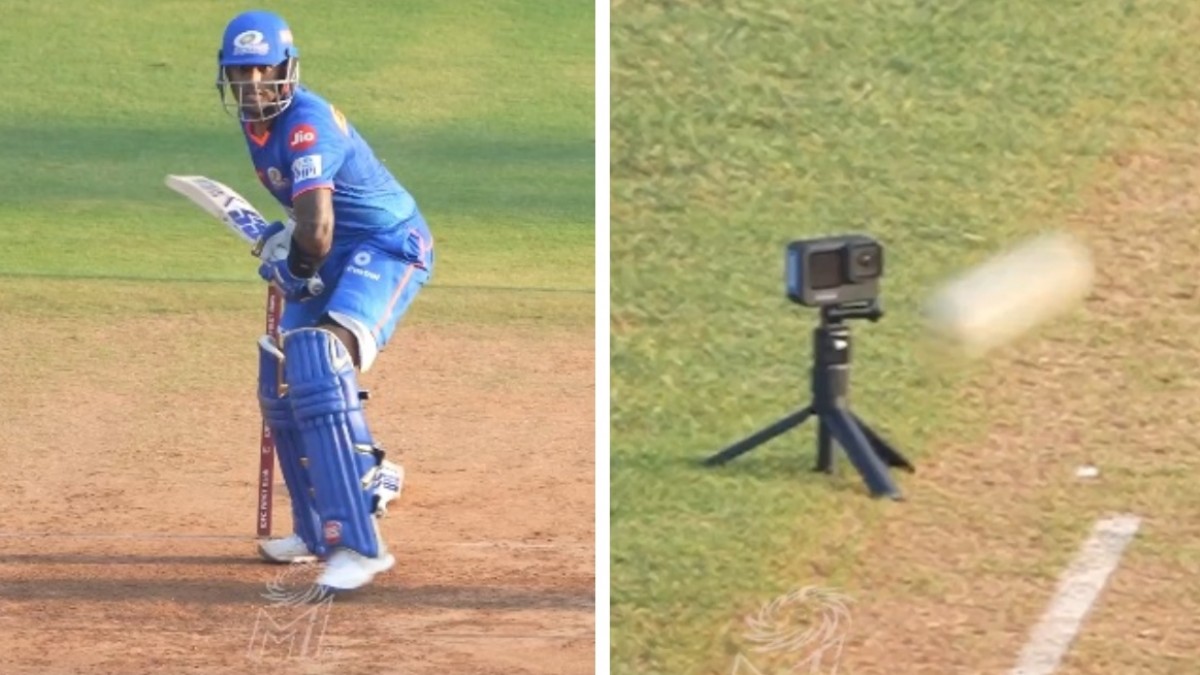 सूर्यकुमार यादव का एक वीडियो मुंबई इंडियंस ने अपने एक्स हैंडल से शेयर किया है। इसमें वो नेट्स पर प्रैक्टिस करते नजर आ रहे हैं और उनके पीछे की तरफ एक छोटा सा कैमरा वीडियो रिकॉर्ड करने के इरादे से रखा दिख रहा था। सूर्यकुमार के शॉर्ट गेंद को बैकफुट पर जाकर बस बैट अड़ाते हैं और गेंद पीछे सीधे कैमरे पर जाकर लगती है और वो दो टुकड़े हो जाता है।
