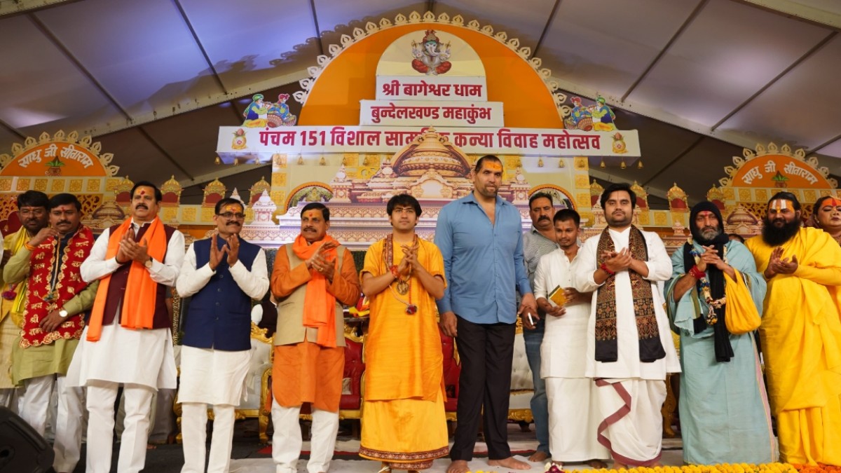 The Great Khali: वर्ल्ड रेसलिंग एंटरटेनमेंट (WWE) में अपने प्रदर्शन से छाप छोड़ने वाले भारतीय रेसलर द ग्रेट खली (दलीप सिंह राणा) का एक वीडियो इन दिनों सोशल मीडिया पर छाया हुआ है। खली हाल ही में मध्य प्रदेश के छतरपुर जिले में स्थित बांगेश्वर धाम पहुंचे थे। अंतरराष्ट्रीय महिला दिवस के अवसर पर बागेश्वर धाम में 151 कन्याओं का समूहिक विवाह हुआ था। इस सामूहिक विवाह कार्यक्रम में मध्य प्रदेश के मुख्यमंत्री डॉ मोहन यादव भी शामिल हुए। कार्यक्रम के दौरान खली ने कथावाचक धीरेंद्र शास्त्री से कहा कि मेरा पर्चा निकालना है।