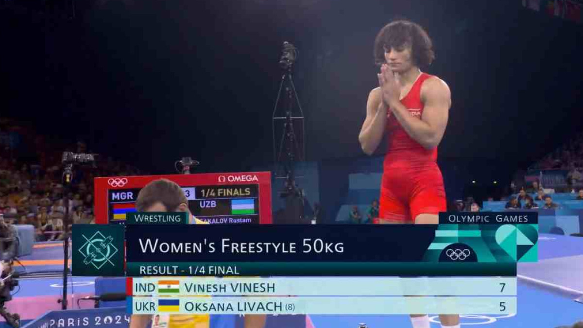 Vinesh Phogat: पेरिस ओलंपिक के 11वें दिन भारतीय महिला पहलवान विनेश फोगाट 50 किलोग्राम वर्ग के सेमीफाइनल में पहुंच गई। विनेश ने क्वॉर्टर फाइनल में यूक्रेन की ओकसाना लिवाच को 7-5 से हराया। इससे पहले प्री-क्वॉर्टरफाइनल में गोल्ड मेडलिस्ट और मौजूदा वर्ल्ड चैंपियन जापान की यूई सुसाकी को 3-2 से हराया।