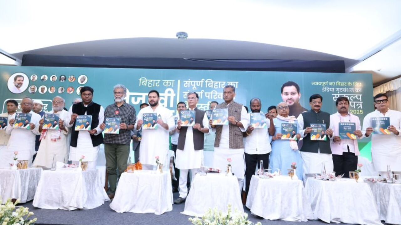 बिहार विधानसभा चुनाव 2025 से पहले महागठबंधन ने अपना घोषणापत्र ‘बिहार का तेजस्वी प्रण’ जारी किया। इसमें हर परिवार से एक सदस्य को सरकारी नौकरी, ₹500 में गैस सिलेंडर और शराबबंदी कानून की समीक्षा जैसे कई वादे शामिल हैं।