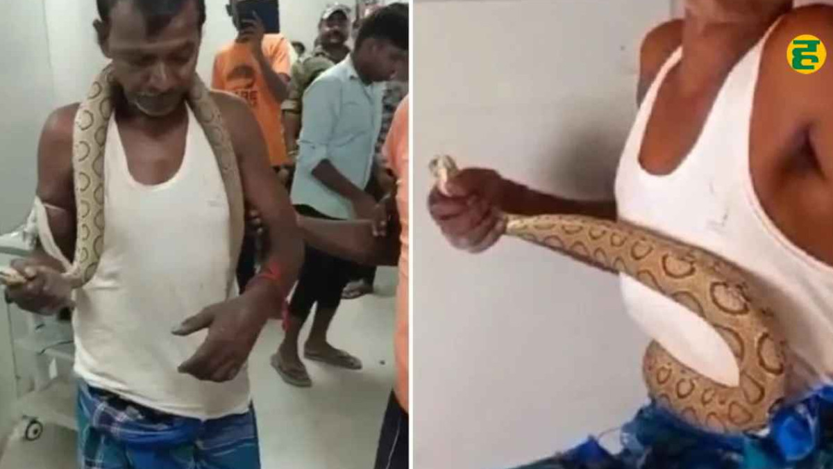 जीरोमाइल थाना क्षेत्र के मीराचक में रहने वाला प्रकाश मंडल मंगलवार रात को घर जा रहा था। रास्ते में प्रकाश के दाहिने हाथ में उसे रसेल वाइपर सांप ने डस लिया। प्रकाश को गुस्सा आया। सांप के मुंह को पकड़ा। कंधे पर लटकाया और अस्पताल लेकर पहुंच गया। डॉक्टर ने मरीज के पास जाने से इनकार कर दिया तो प्रकाश सांप के साथ फर्श पर लेट गया।