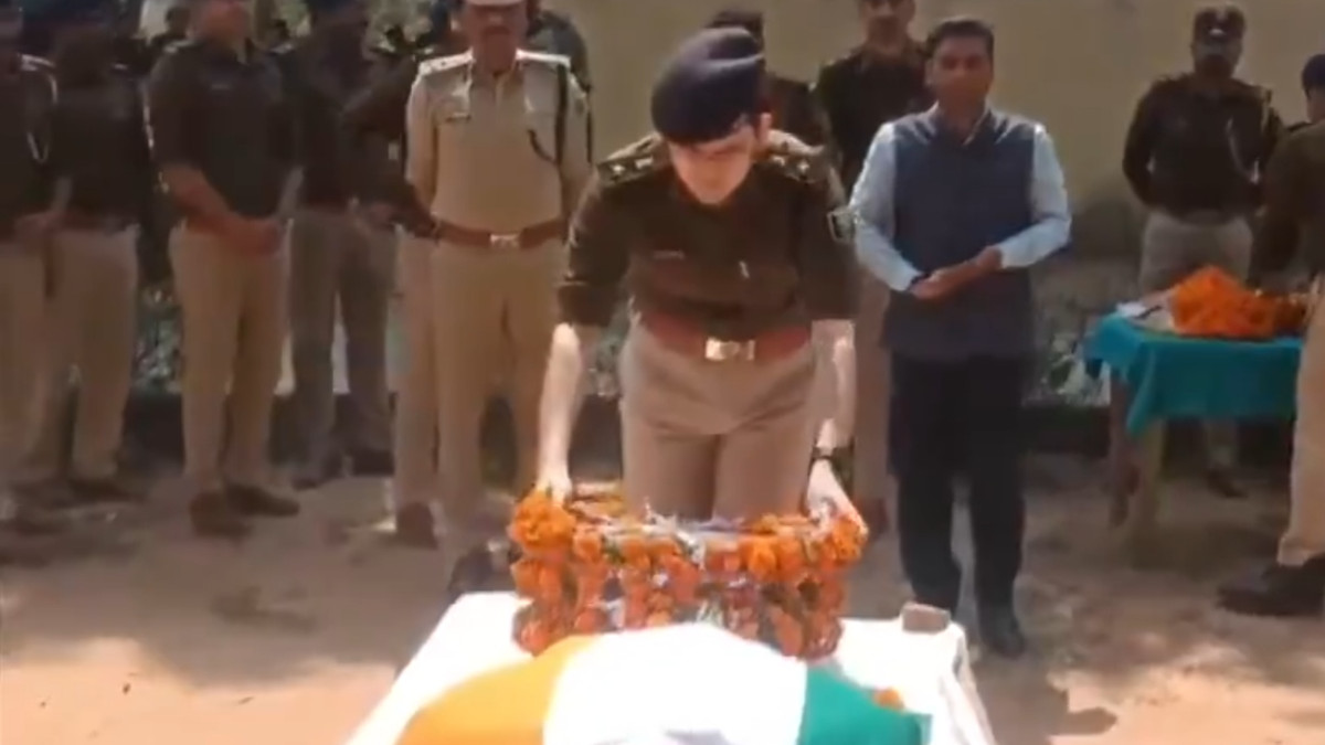 #WATCH | Bihar: Police personnel lay a wreath and pay last respects to ASI Santosh Kumar Singh in Munger.