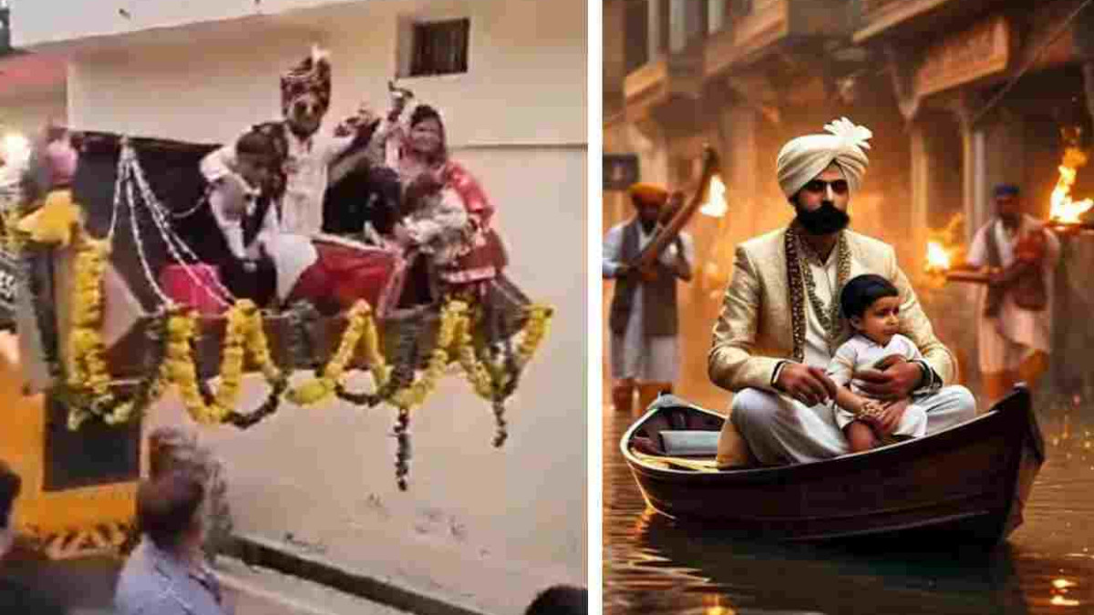 बारिश ने बदला शादियों का ट्रेंड: गोपालगंज में नाव से निकली बारात, गोरखपुर में बुलडोजर पर सवार होकर पहुंचा दूल्हा