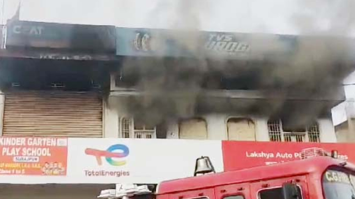 नौशाद अहमद - सूरजपुर। छत्तीसगढ़ के सूरजपुर जिले में एक ऑटो पार्ट्स की दुकान में गुरुवार को भीषण आग लग गई। आग लगने से आस पास मौजूद लोगों में अफ़रा-तफ़री मच गई। लोग जैसे- तैसे जान बचाकर वहां से बाहर निकले।