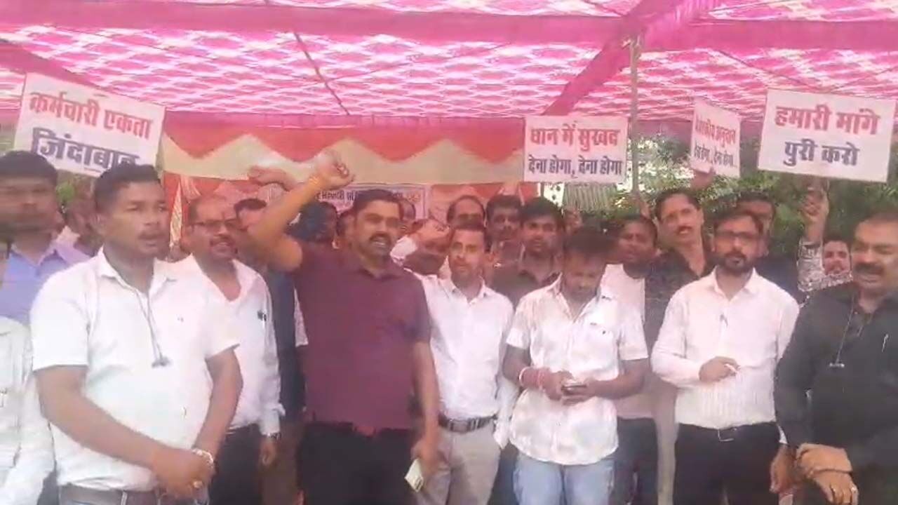 चार सूत्रीय मांगों को लेकर हड़ताल करते सहकारी समिति के कर्मचारी