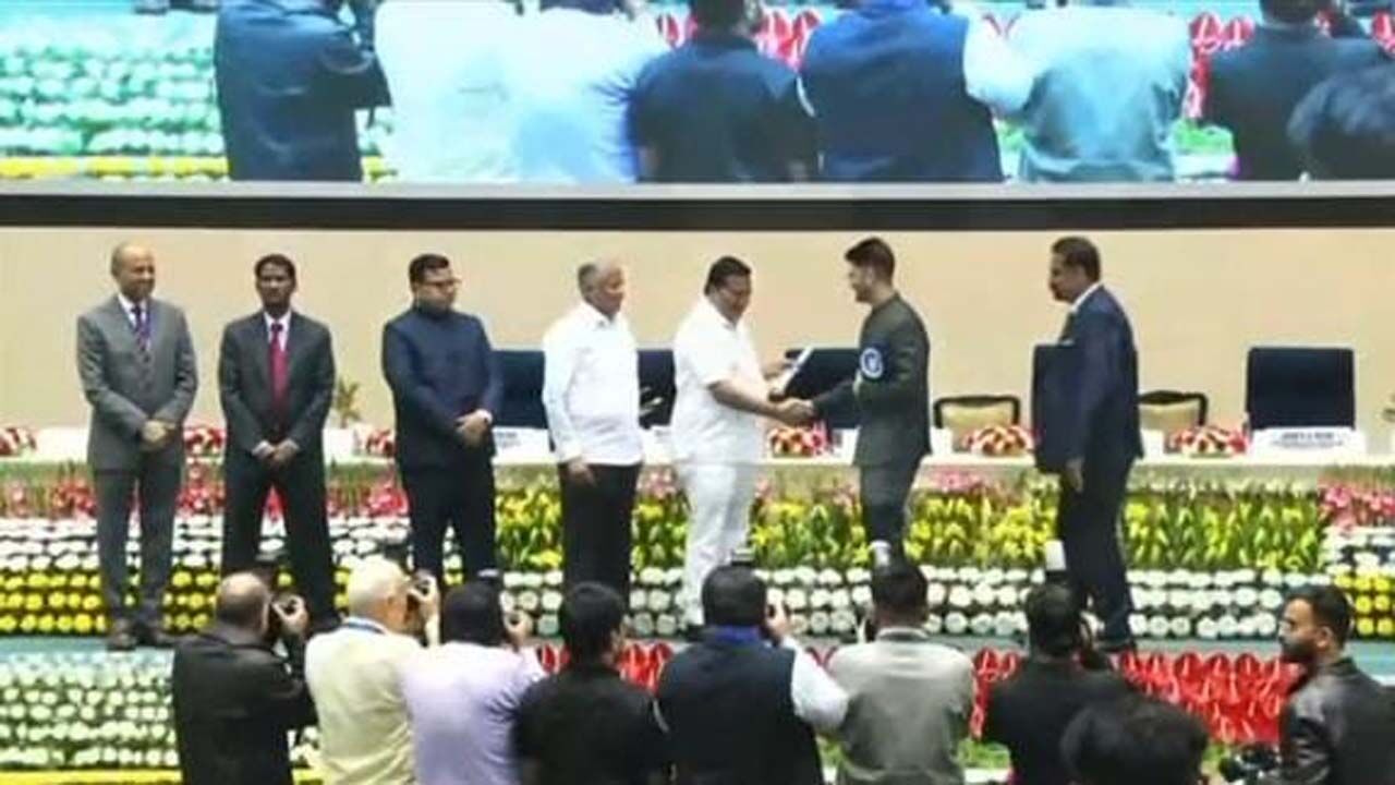 कलेक्टर दीपक सोनी पुरस्कार लेते हुए