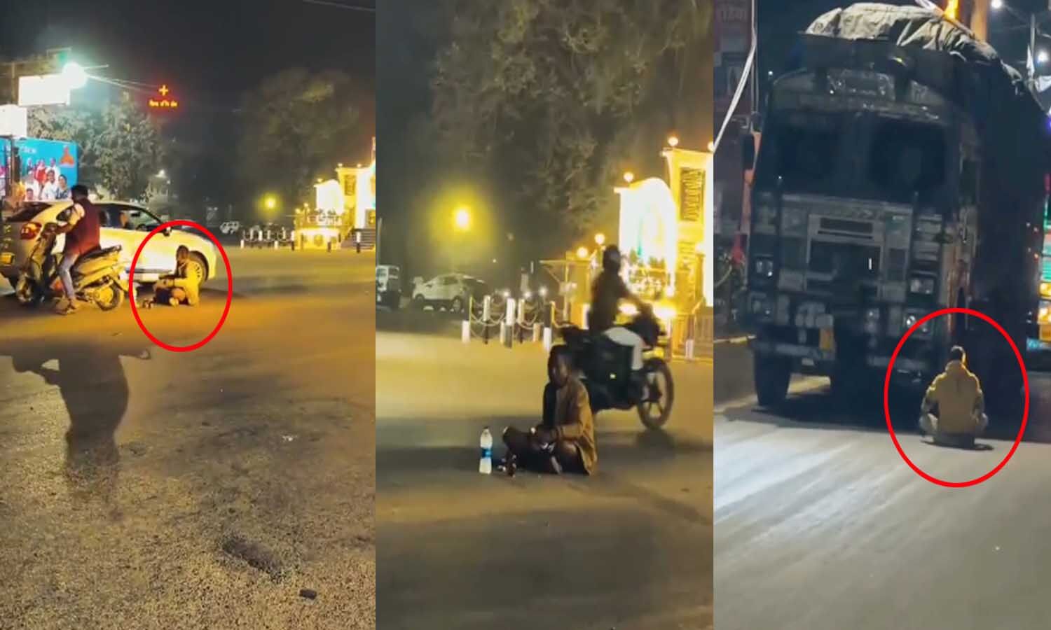 बीच सड़क पर बैठकर शराब पीता हुआ शराबी