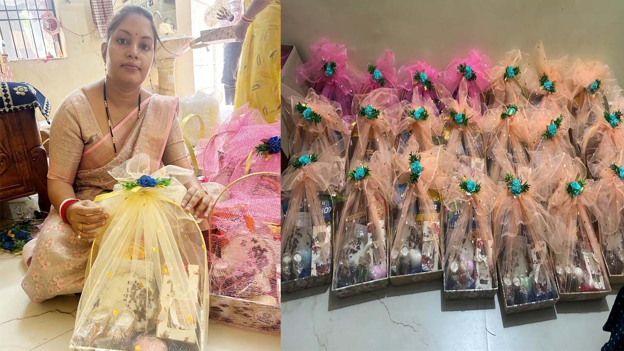 गिफ्ट हैंपर पैक करती हुई स्व-सहायता समूह की महिलाएं