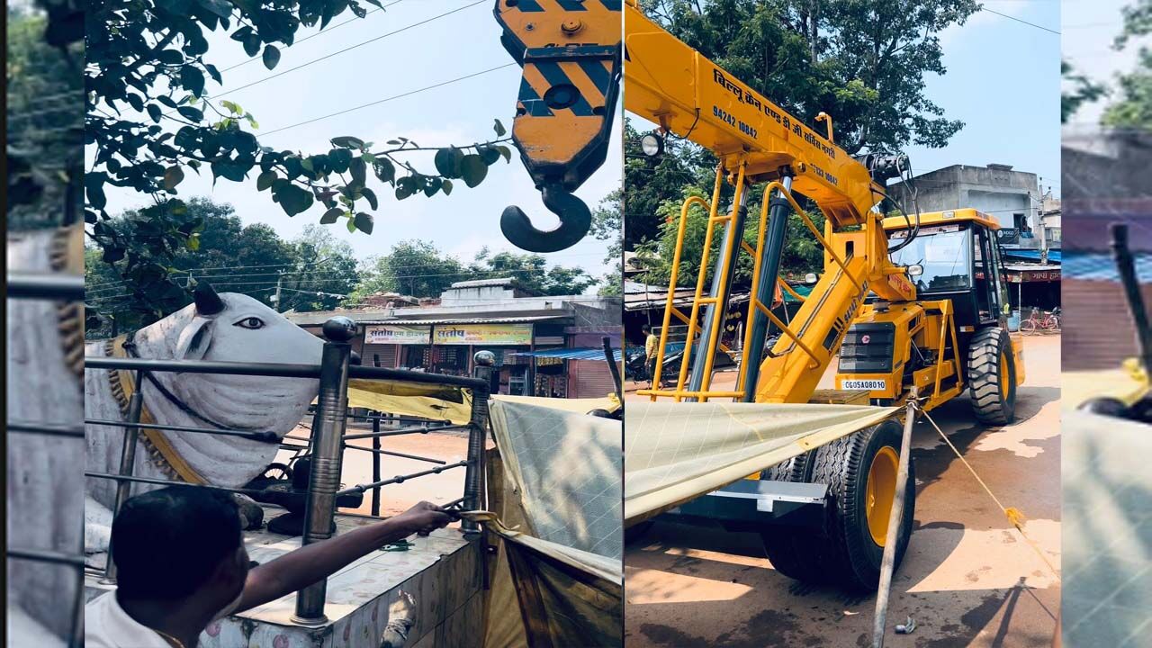 नगरी के नंदी चौक को विस्थापित करने पहुंची क्रेन