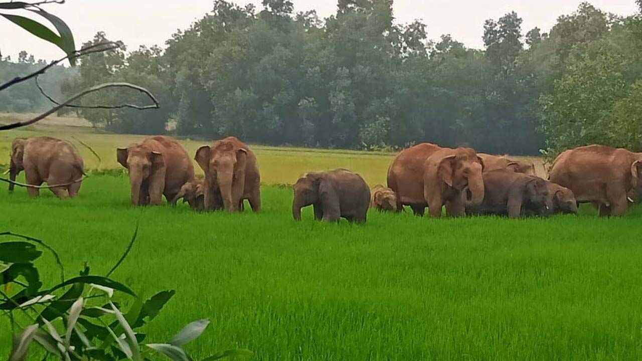 फसल को बर्बाद करते हुए हाथियों का झुंड