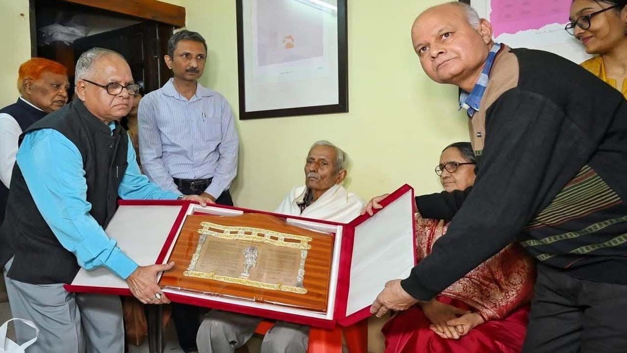 विनोद शुक्ल के घर पहुंचे 'ज्ञानपीठ' के महाप्रबंधक: वाग्देवी की प्रतिमा और पुरस्कार का चेक सौंपा, शुक्ल बोले- मेरे लिए लिखना सांस लेने की तरह