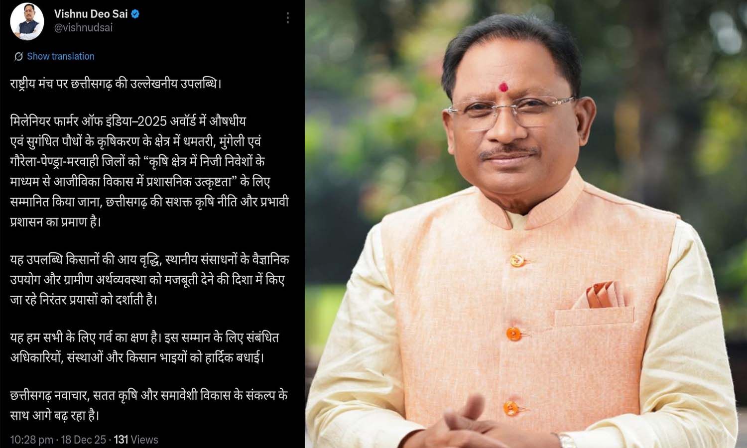 सीएम साय ने इस उपलब्धि को लेकर कहा कि 'यह सम्मान छत्तीसगढ़ की सशक्त कृषि नीति, प्रभावी प्रशासन और हमारे किसान भाइयों की मेहनत का प्रमाण है। छत्तीसगढ़ नवाचार, सतत कृषि और समावेशी विकास के संकल्प के साथ आगे बढ़ रहा है।'