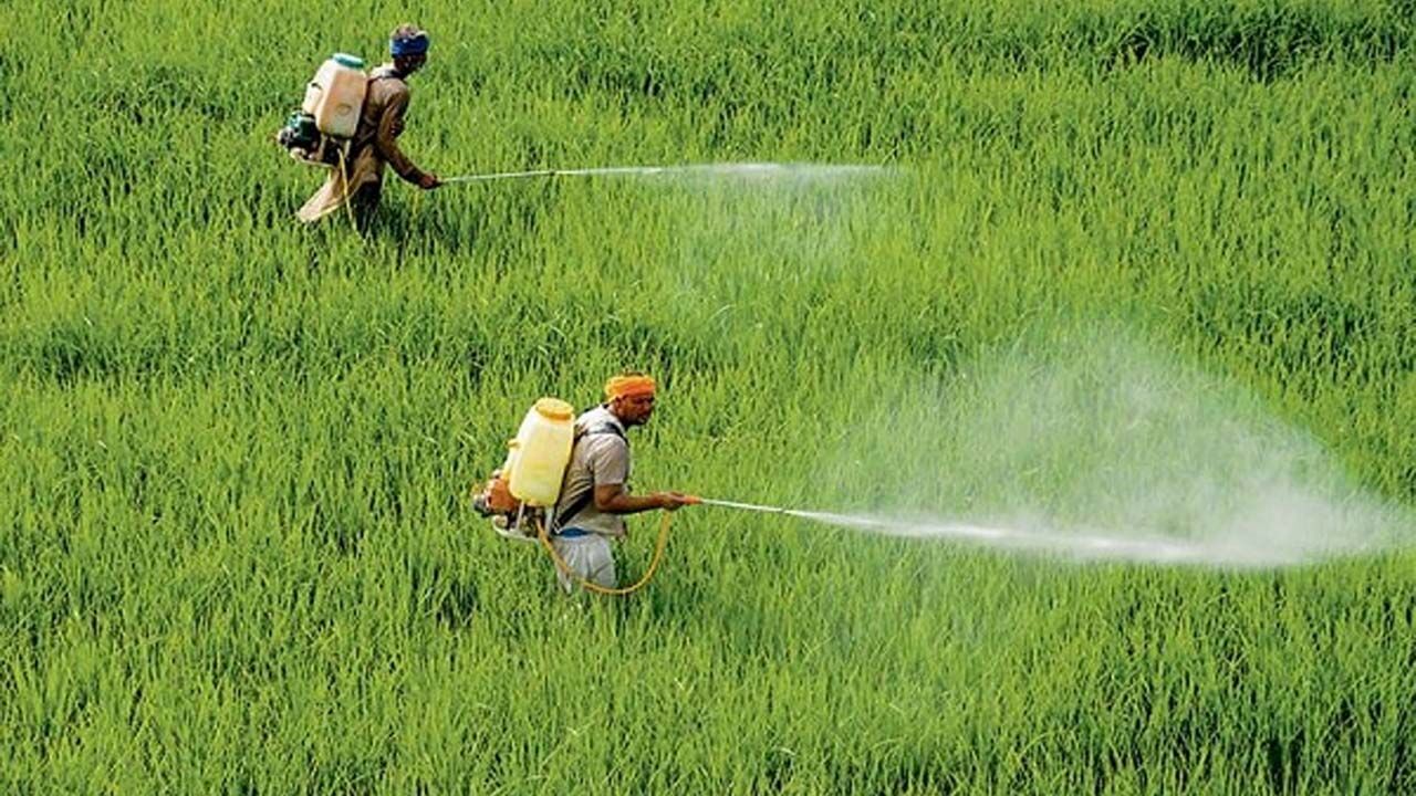 खेत पर उगाई गई फसल में कीटनाशक का छिड़काव करते हुए किसान