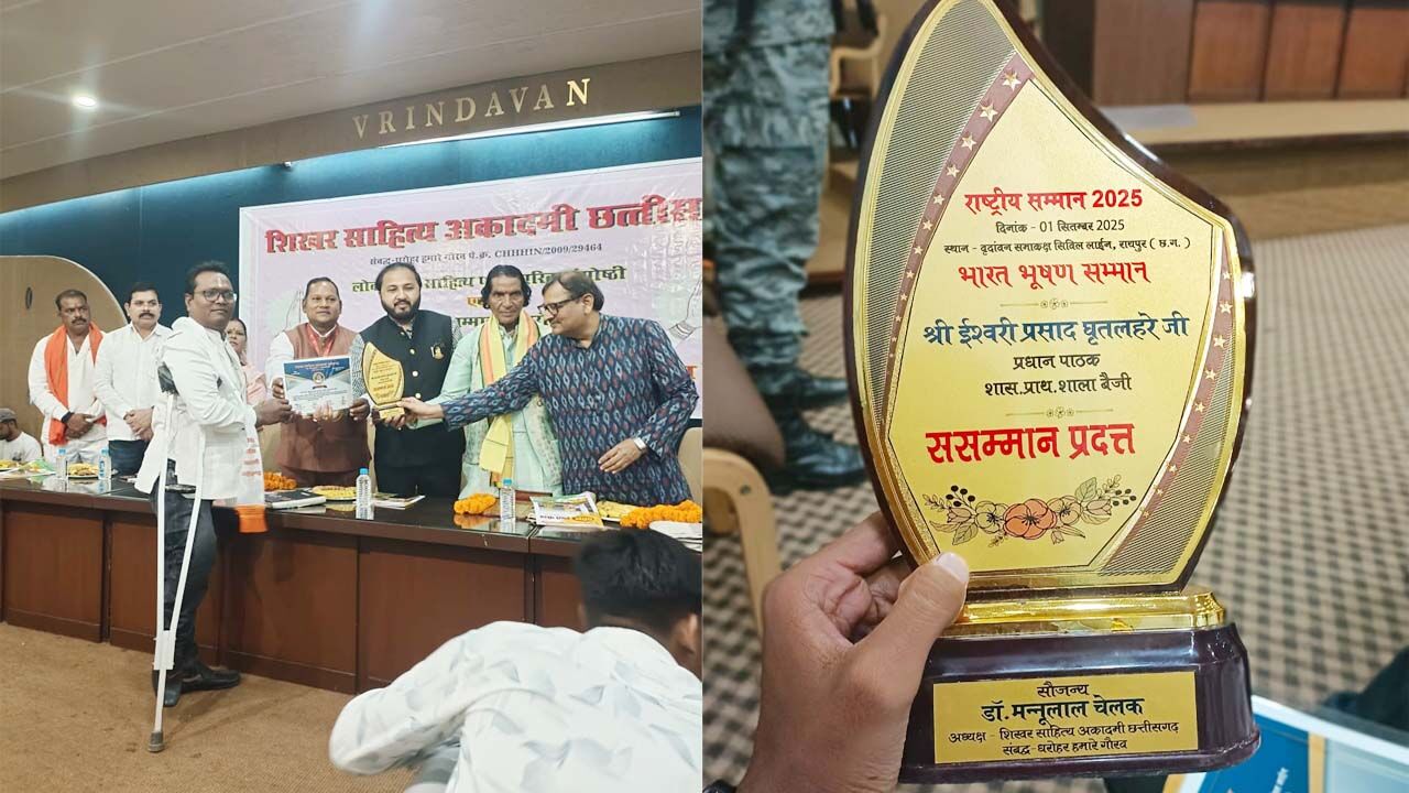 रायपुर के वृंदावन टाउन हॉल में 1 सितंबर को राष्ट्रीय सम्मान 2025 का आयोजन किया गया। इस मौके पर प्रधान पाठक ईश्वरी प्रसाद घृतलहरे को सम्मानित किया गया।