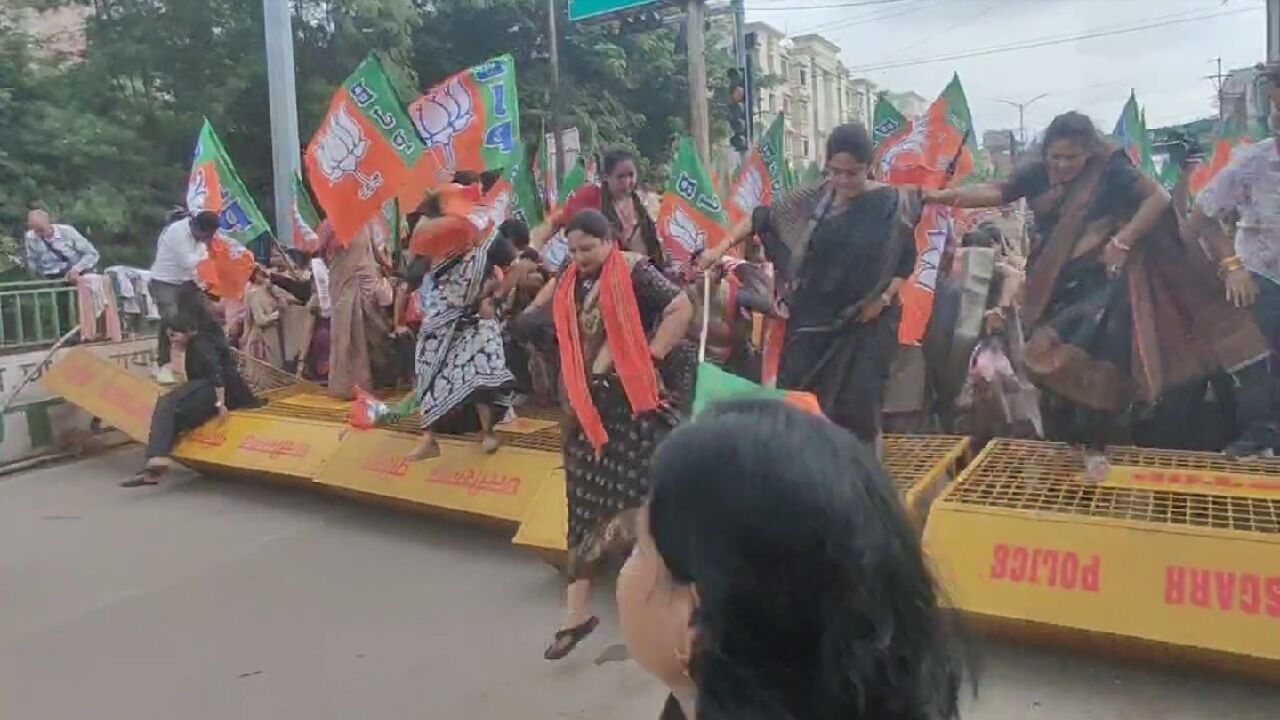 बैरिकेट पार कर राजीव भवन का घेराव करने जातीं भाजपा महिला मोर्चा की नेत्रियां