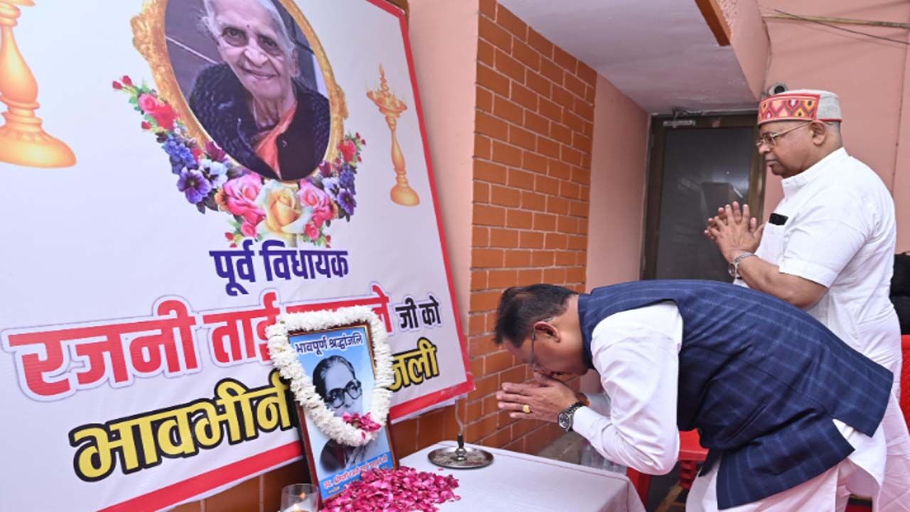 राजधानी के पुलिस लाइन स्थित रायपुर की पहली महिला विधायक एवं समाजसेवी स्वर्गीय रजनी ताई उपासने के निवास सीएम साय पहुँचे और उन्हें श्रद्धांजलि दी।