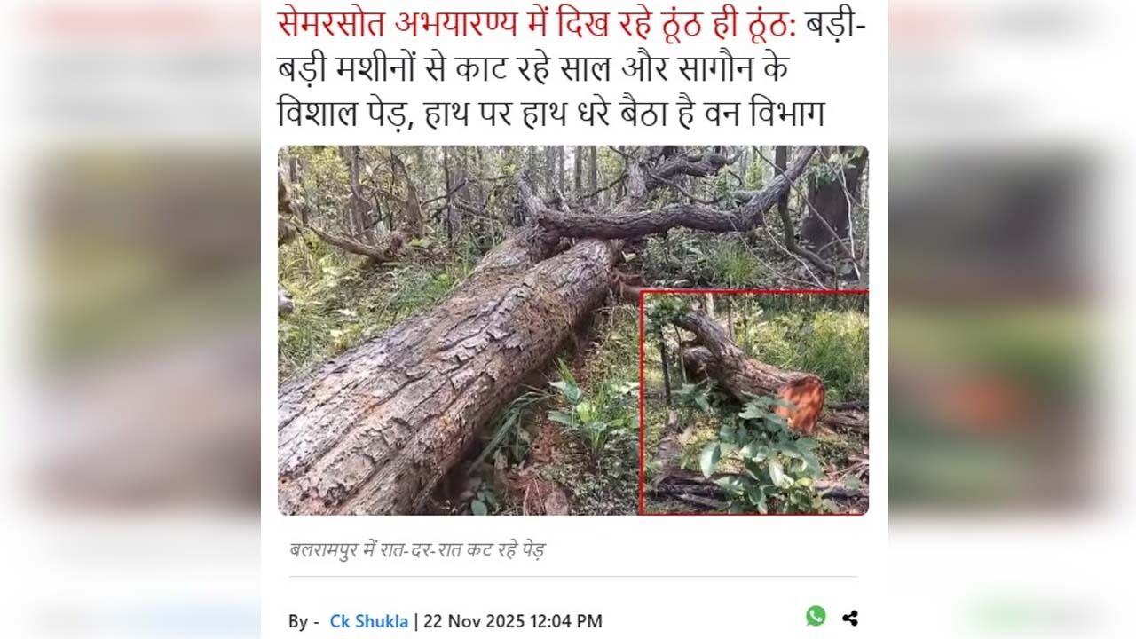 कृष्ण कुमार यादव - बलरामपुर। छत्तीसगढ़ के बलरामपुर जिले के सेमरसोत अभयारण्य से पेड़ों की कटाई का मामला सामने आया था। यहां पर तस्कर रात के अंधेरे का फायदा उठाकर धड़ल्ले से तस्करी कर रहे थे। इसके बाद मामले में हरिभूमि डॉट कॉम में प्रमुखता से खबर प्रकाशित की गई थी। वहीं अब इस खबर का बड़ा असर हुआ है। मामले में वाइल्ड लाइफ डीएफओ और एसडीओ ने संज्ञान लिया है। मौके पर अफसर सेमरसोत अभयारण्य पहुंचे हुए हैं।