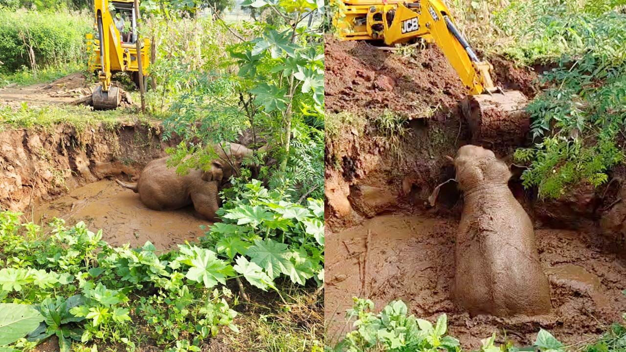 हाथी को गड्ढे से बाहर निकालती हुई जेसीबी