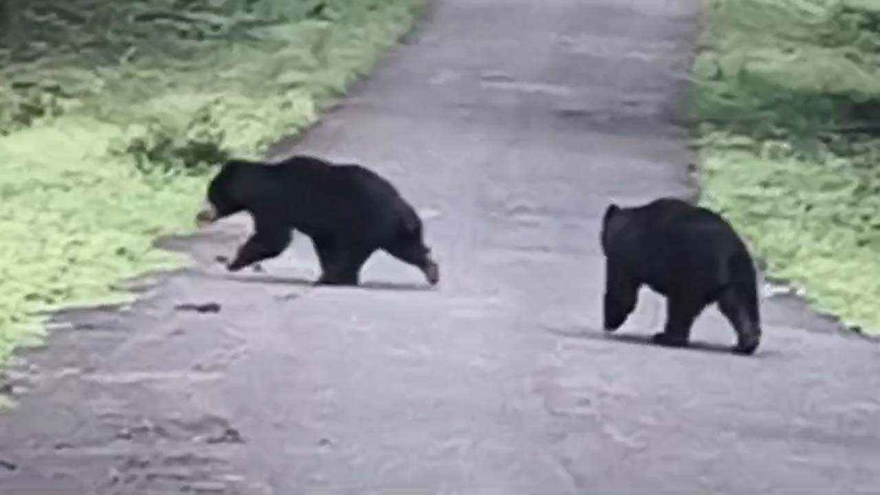 जंगल की सड़क पर खेलते-कूदते नजर आए भालू, राहगीर ने मोबाइल में कैद किया अनोखा नज़ारा।