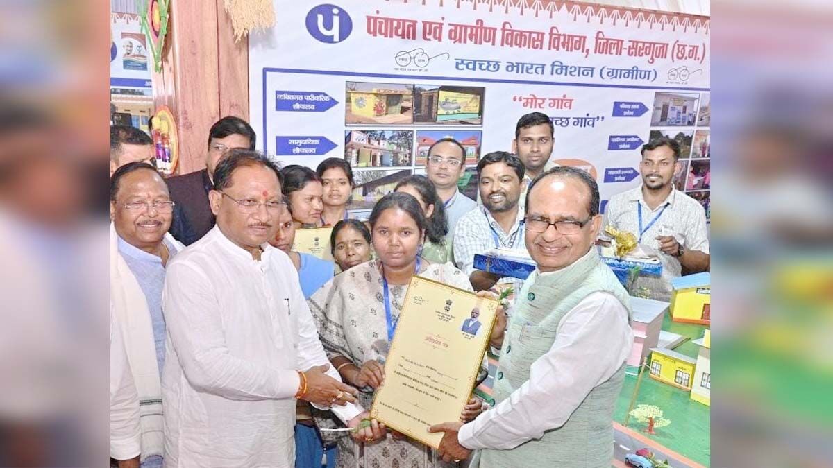 अंबिकापुर जिले में 'मोर आवास मोर अधिकार' कार्यक्रम में उत्कृष्ट कार्य करने वाली स्व-सहायता समूहों की दीदियों को मंत्री शिवराज सिंह चौहान और सीएम साय द्वारा सम्मानित किया गया।