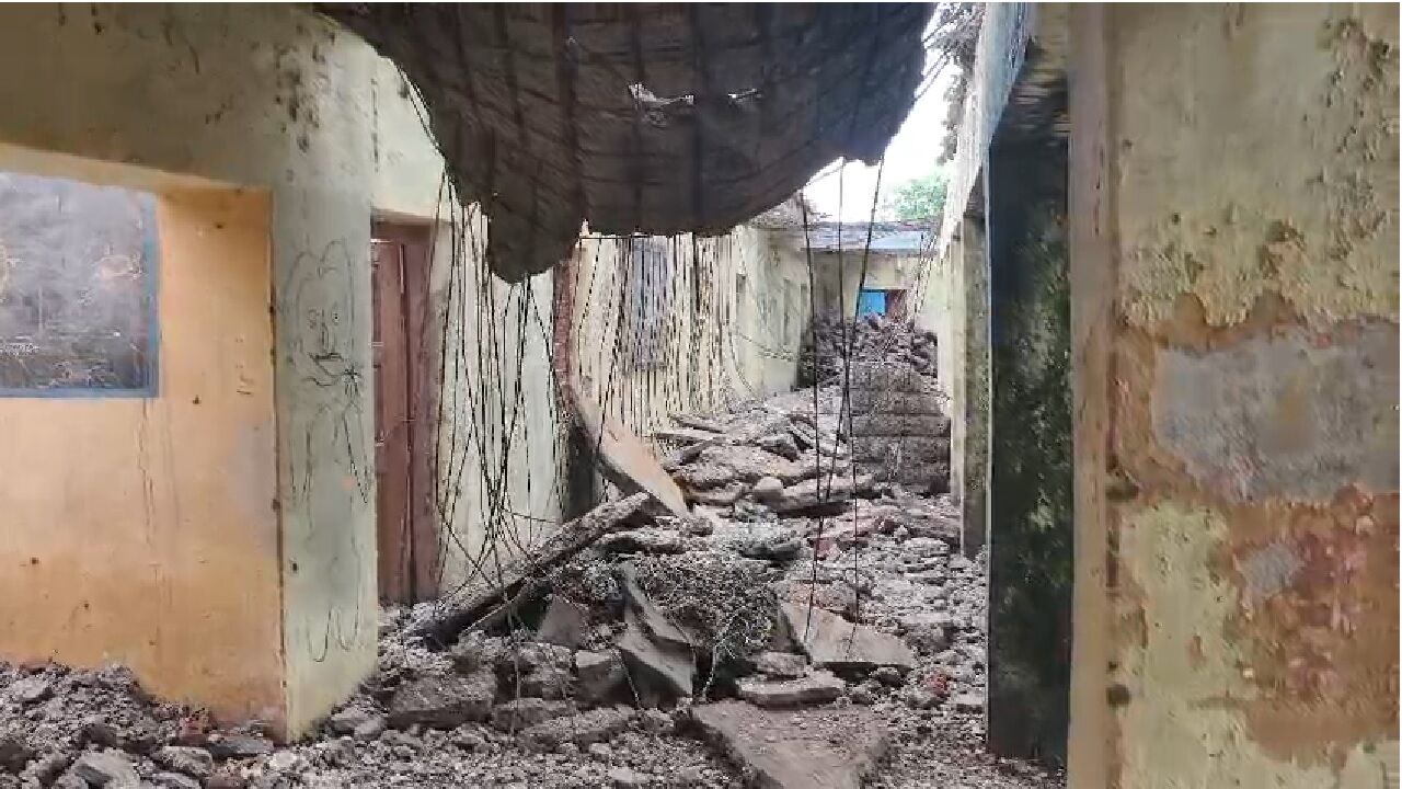 जर्जर स्कूल भवन की गिरी हुई दीवार
