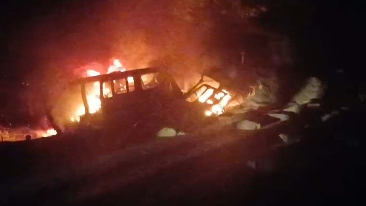सड़क हादसे में एक ड्राइवर की मौत हो गई। तेज रफ्तार ट्रक पहले एक अन्य ट्रक से टकरा गया फिर अनियंत्रित होकर वेन को टक्कर मार दी, जिससे आग लग गई।