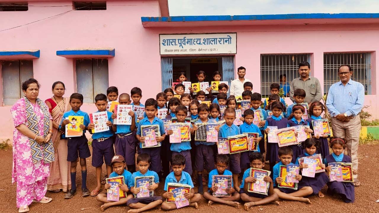 बेमेतरा जिले के रानो स्कूल में नवाचारी शिक्षिका प्रतीक जैन और उनकी बहनों ने अपने स्व. पिता की स्मृति में बच्चों को कॉपी, पेन, पट्टी और पहाड़े उपहार में दिए।