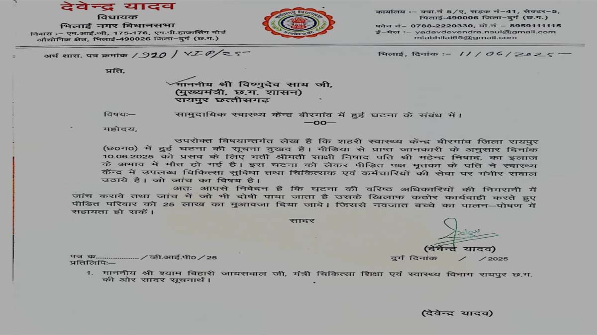 स्वास्थ्य व्यवस्था पर उठे सवाल: विधायक देवेंद्र यादव ने बीरगांव प्रकरण में सीएम को लिखा पत्र, पीड़ित परिवार को 25 लाख मुआवजा देने की मांग