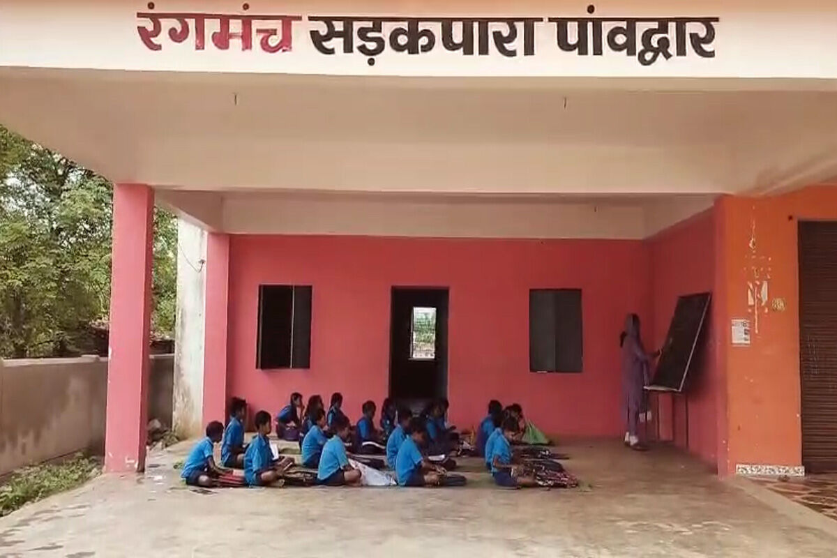 जर्जर हो गया स्कूल भवन: नगरी ब्लाक के पांवद्वार प्राथमिक शाला के बच्चे रंगमंच पर बैठकर पढ़ने को मजबूर