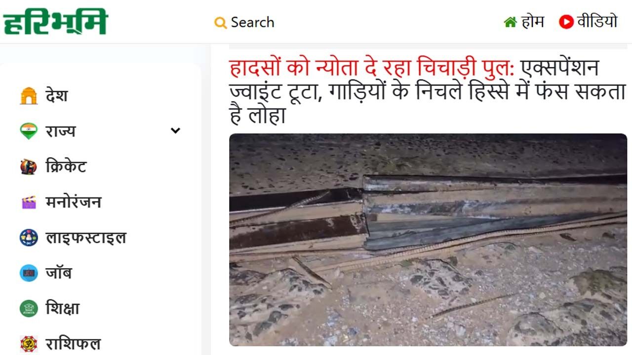 हरिभूमि डॉट कॉम की खबर का असर: चिचाड़ी पुल के टूटे ज्वाइंट की मरम्मत करने पहुचे कर्मचारी