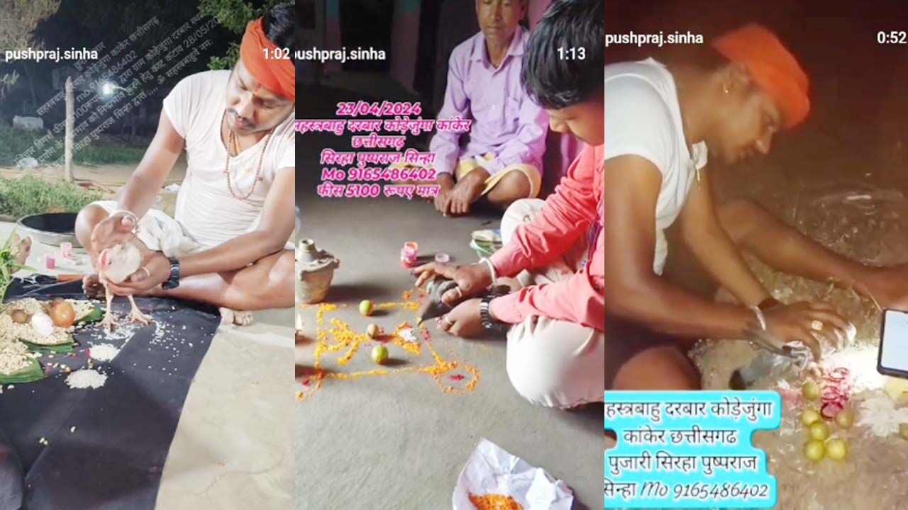गौरव श्रीवास्तव- कांकेर। छत्तीसगढ़ के कांकेर जिले से एक हैरान कर देने वाला मामला सामने आया है। जहां शहर से सटे कोडेजुंगा गांव में आस्था के नाम पर अंधविश्वास का खेल खुलेआम खेला जा रहा है। भूत-प्रेत भगाने और इलाज का दावा करने वाला एक बैगा पशु-पक्षियों की बलि चढ़ाकर लोगों को गुमराह कर रहा है। यही नहीं, इस पूरे घटनाक्रम का विडिओ सोशल मीडिया पर भी वायरल किया गया है।