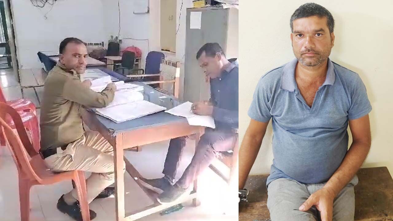 पुलिस की गिरफ्त में आरोपी (नीली टीशर्ट वाला)
