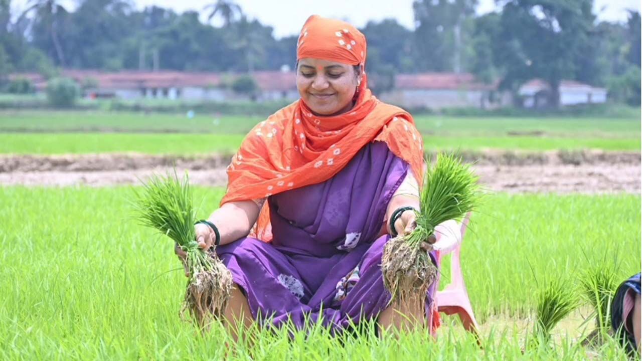 मंत्री लक्ष्मी राजवाड़े खेत में कुर्सी पर बैठकर धान का थरहा निकालते हुए
