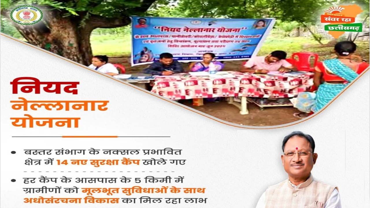 बस्तर संभाग के नक्सल प्रभावित जिलों में शासन की योजनाओं को बेहतर तरीके से जनता तक पहुँचाने के उद्देश्य से सरकार ने वर्ष 2024 में 'नियद नेल्लानार योजना' की शुरुआत की। 'नियद नेल्लानार का अर्थ 'हमारा गांव' या 'हमारा घर' होता है। जिसके तहत दूर- सुदूर इलाकों के गांव में सरकार की योजनाओं पहुँचाया जा रहा है। साथ ही लोगों की मूलभूत जरूरतों को भी प्राथमिकता से पूरी की जा रही है। इस योजना के तहत कृषि पंप कनेक्शन योजना, धान खरीदी, मुख्यमंत्री सुपोषण जैसी योजनाएं संचालित की जा रही हैं।