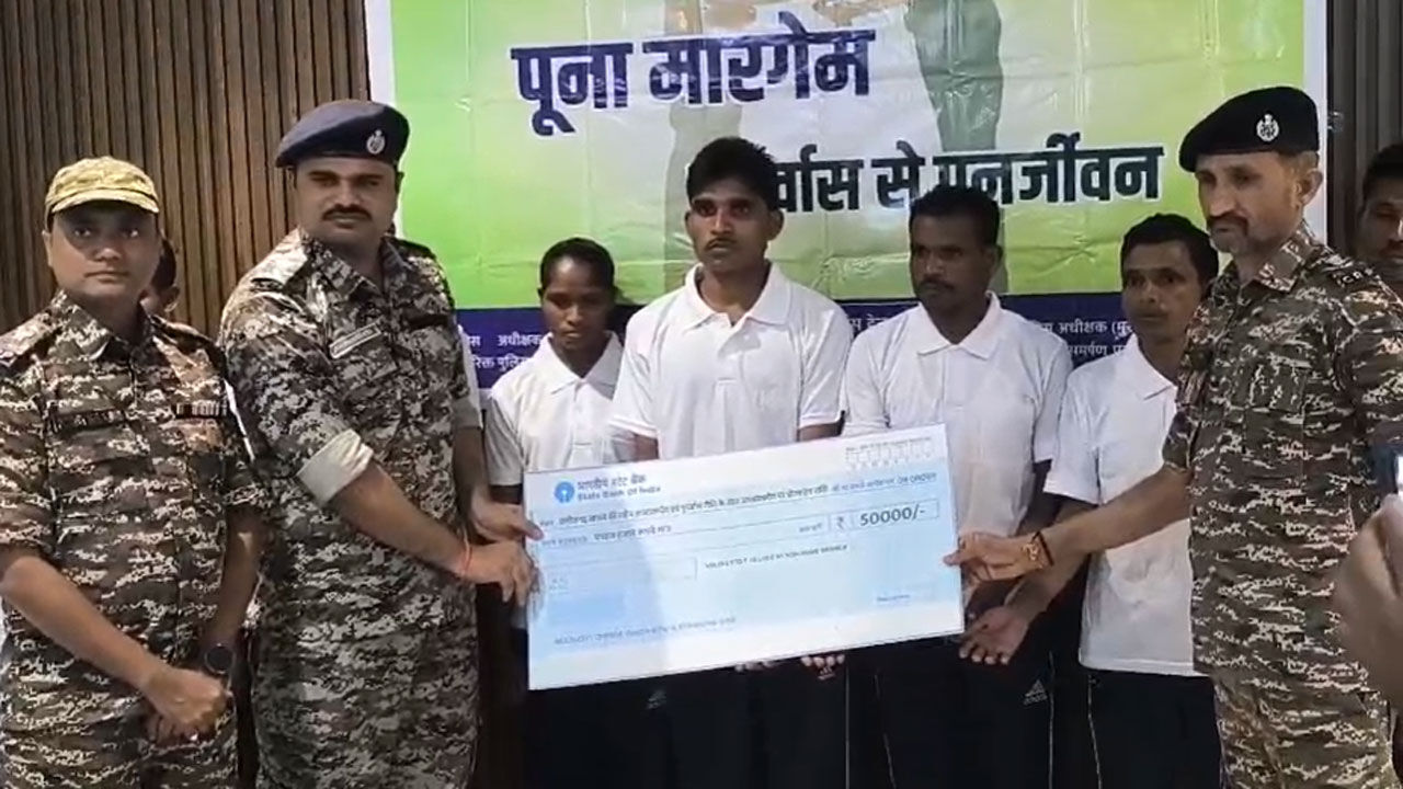आत्मसमर्पित नक्सलियों को चेक देते हुए जवान