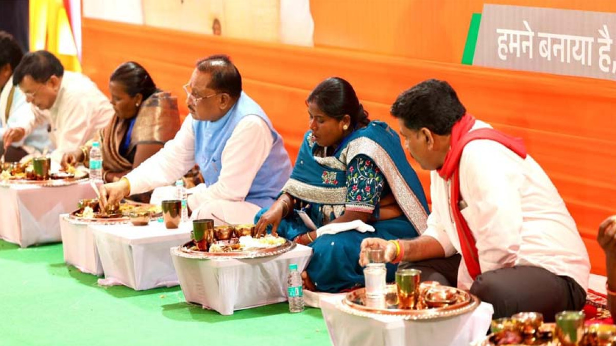 हितग्राहियों के साथ भोजन : मुख्यमंत्री विष्णुदेव साय ने आवास योजना के लाभार्थियों के साथ बैठकर खाया खाना