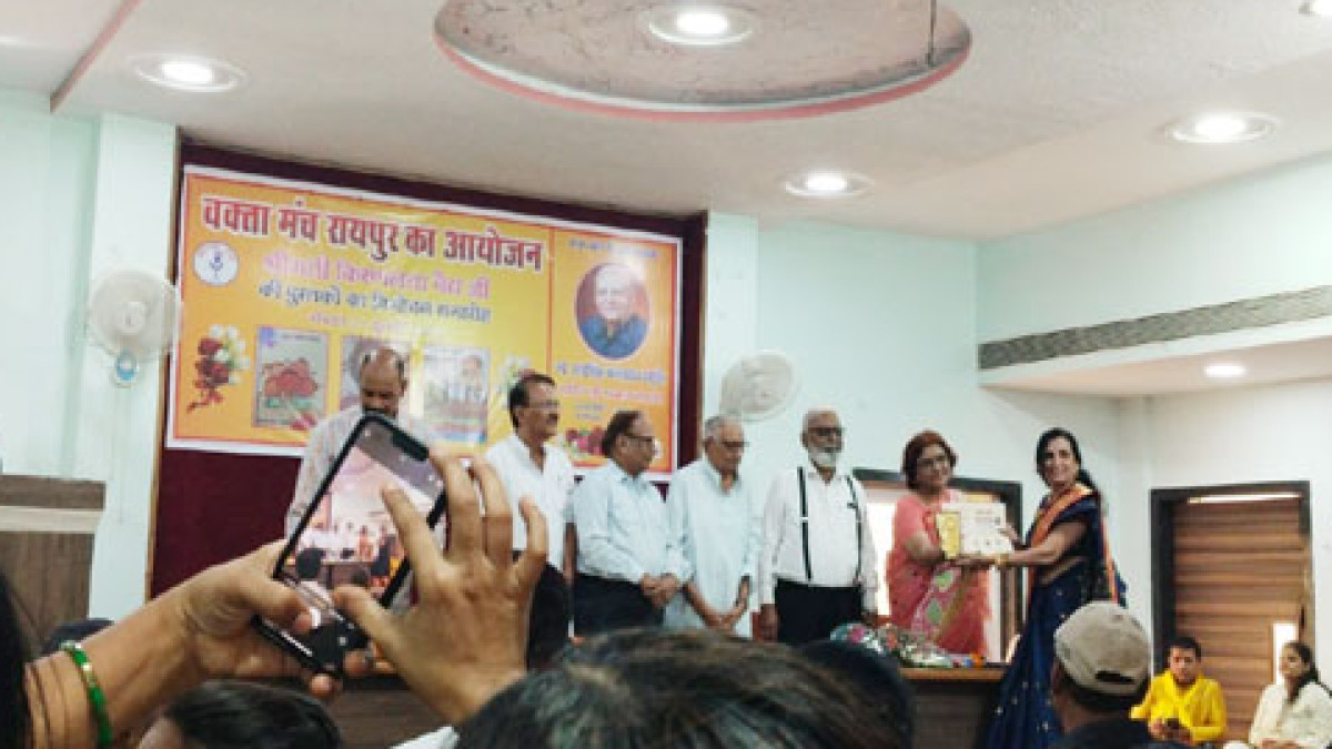 रायपुर। प्रदेश की साहित्यिक संस्था ‘वक्ता मंच’ ने रायपुर के गुरु घासीदास अकादमी में रचानाकार सम्मान समारोह का आयोजन किया था। इस आयोजन में प्रदेश के 100 रचनाकारों को स्व. छत्रसिंह बच्छावत स्मृति साहित्य श्री सम्मान से विभूषित किया गया। इस अवसर पर राजधानी रायपुर की प्रतिष्ठित लेखिका किरणलता वैद्य के बाल साहित्य पर केंद्रित 2 कविता संग्रह मुस्कान और मोनू मंकी का विमोचन भी हुआ। संगीत शिक्षक विनय बोपचे के निर्देशन में बाल कलाकारों ने विमोचित हो रहे काव्य संग्रह की कविताओं पर आधारित गीतों और बाल नाटिका का मंचन भी कियाl