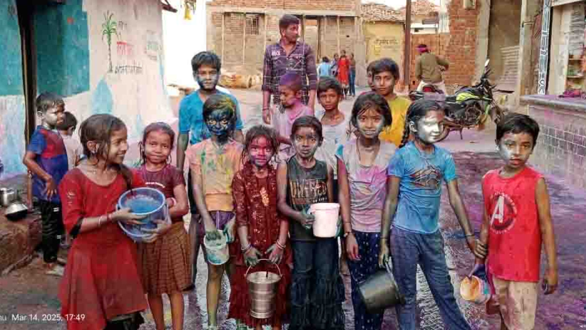 सुबह से ही नन्हे- नन्हे बच्चों की टोली दल बनाकर साथ मिल करके रंग गुलाल खेलने लगी। सुबह से बच्चे तरह-तरह के रंगो के गुलाल लेकर और पिचकारी लेकर, गुब्बारे में रंगीन पानी भरकर घरों से निकले। गली गली और चौक चौराहे में बच्चों की टोली रंग गुलाल खेलने लगी। छोटे-छोटे बच्चे अपने घरों में माता-पिता से लेकर के भैया, भाभी, बहन, सभी को रंगों से सराबोर करने लगी।