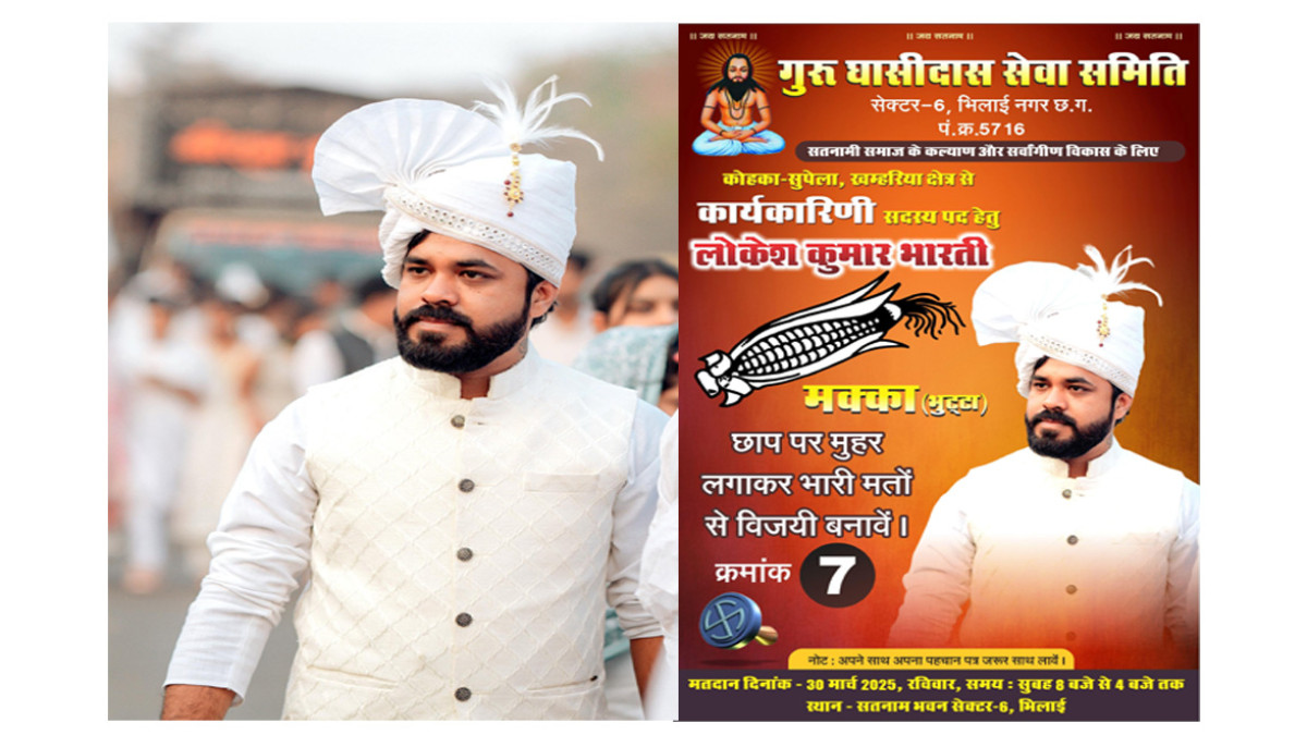 भिलाई। गुरु घासीदास सेवा समिति पं.क्र.5716 के पदाधिकारियों का कार्यकाल मार्च में समाप्त हो रहा है। इस वजह से आमसभा चुनाव का आयोजन 30 मार्च को सुबह 8 से 4 बजे तक सतनाम भवन सेक्टर-6 में होगा। सतनामी समाज के कल्याण और सर्वांगीण विकास के लिए कोहका-सुपेला, खम्हरिया क्षेत्र से कार्यकारिणी सदस्य प्रत्याशी लोकेश कुमार भारती को मक्का छाप पर मुहर लगाकर भारी मतों से विजयी बनावें ।