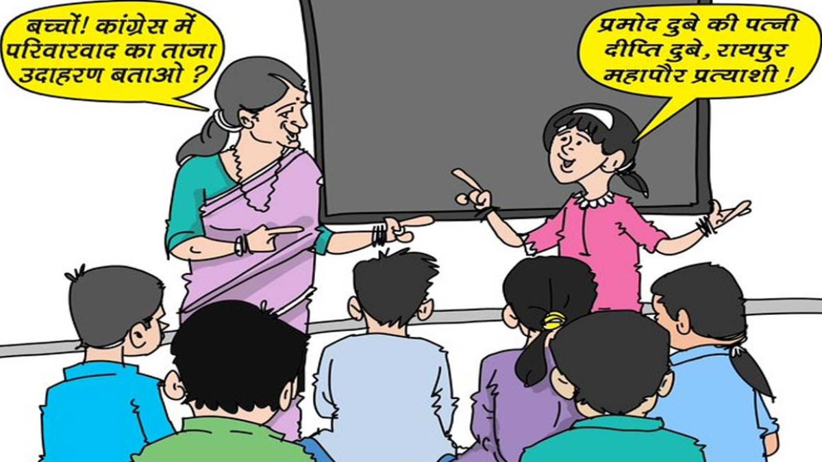 रायपुर। छत्तीसगढ़ में नगरीय निकाय चुनाव से पहले सियासी हलचल तेज हो गई है। कांग्रेस- बीजेपी में पोस्टर वार का सिलसिला भी जारी हो गया है। भाजपा ने कार्टून जारी कर कांग्रेस पर निशाना साधते हुए X पर पोस्ट कर लिखा कि, कांग्रेस परजीवी- प्रदेश का बच्चा-बच्चा जानता है, कांग्रेस परिवारवाद की मूर्ति है। कार्टून के माध्यम से भाजपा ने कांग्रेस महापौर प्रत्याशी को लेकर परिवारवाद पर तंज कसा है।