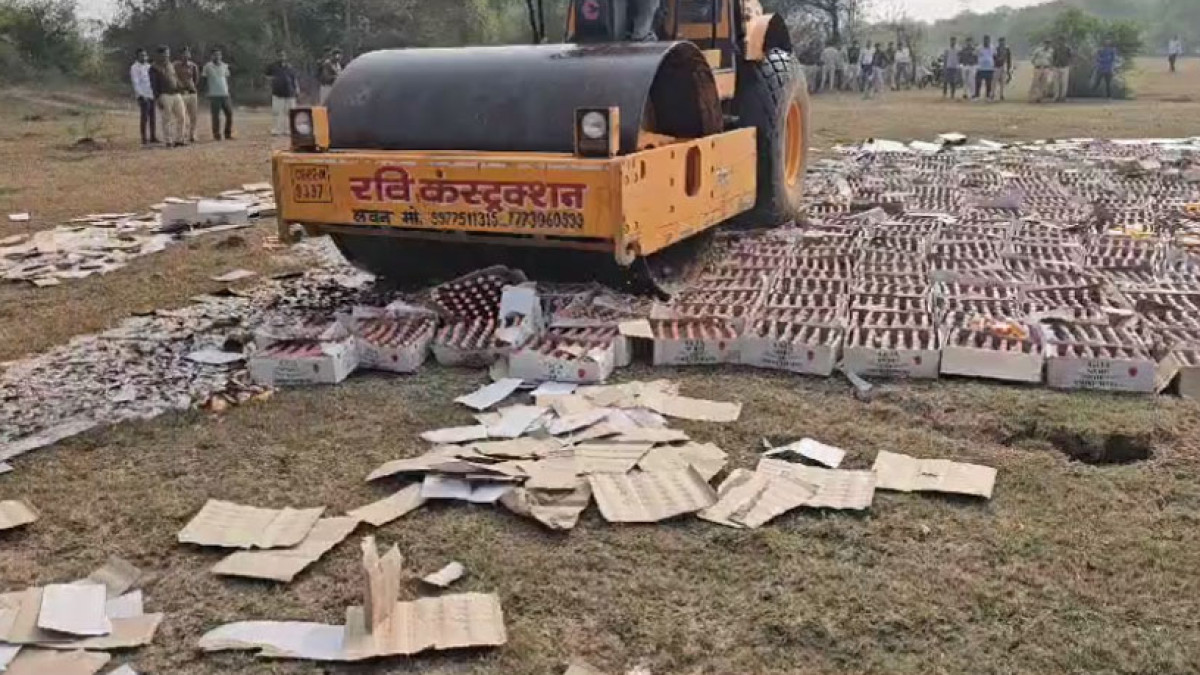 सालों से जब्त शराब का जखीरा नष्ट : विभिन्न ब्रांडों के 33 हजार लीटर मदिरा बुलडोजर से रौंदा गया