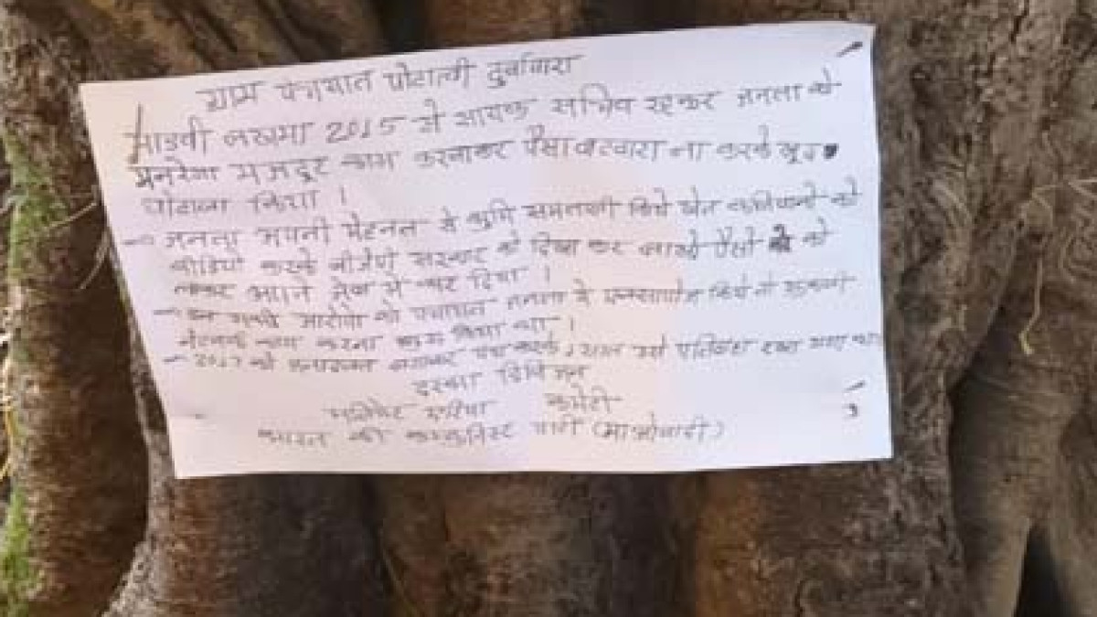 नक्सलग्रस्त इलाके पोटाली बाज़ार में नक्सलियों की दरभा डिवीजन की मलंगीर कमेटी के पर्चे, सरपंच के आरोपी पति के ग्राम पंचायत में 2015 से मनरेगा मजदूरों का पैसा खाने का आरोप लगा है। ग्रामीणों के भूमि समतलीकरण का पैसा खाने के भी आरोप लगे हैं।वर्ष 2017 में नक्सलियों ने सरपंच पति पर 1 साल के लिए गांव से निकलने पर भी प्रतिबंध लगाने की बात लिखी थी ।