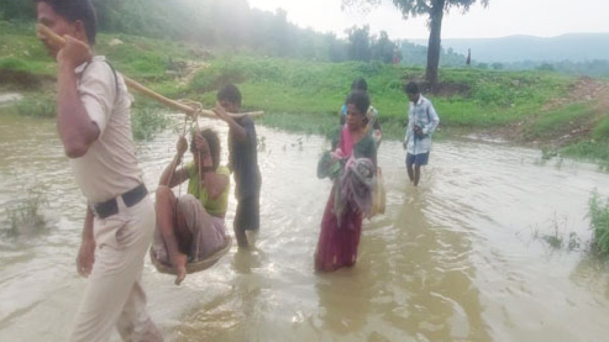 आरक्षक और साथी गर्भवती महिला को कांवड़ से वाहन तक ले गए