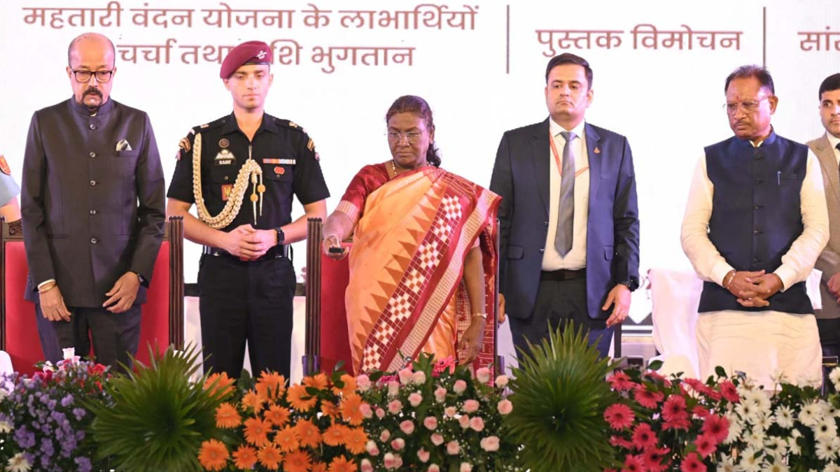 छत्तीसगढ़ के नया रायपुर स्थित पुरखौती मुक्तांगन में आयोजित एक कार्यक्रम में राज्य सरकार की महतारी वंदन योजना की 9वीं किश्त राष्टपति ने महिलाओं के खाते में डाली।