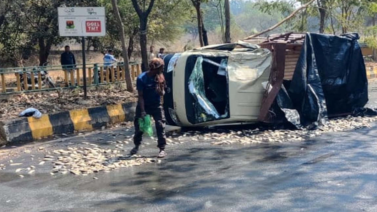 सड़क पर मछली ही मछली : छोटा हाथी पलटा, एयरपोर्ट रोड पर बिखरीं मछलियां